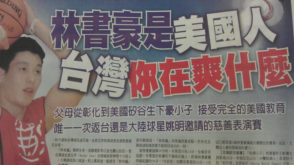 林书豪 林书豪最近爆发了,很多人关心,很多人引以为傲。 对于林书豪,大陆媒体的介绍是“华裔,祖籍福建”,台湾媒体的介绍是:“华裔,祖籍台湾”,仿佛这样的介绍此刻也能带给自己些许的荣光。新华社甚至发文劝林书豪:“抓住机遇放弃美国国籍加入中国队”。网友评论“人家吃饭吃得好好的,你走过去说,来吃屎吧”。 终于有台湾媒体忍不住了,在报纸上发了篇林书豪是美国人的真相。 对明星人物,关心是一回事,引以为傲是另外一回事。