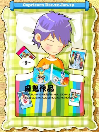 昨天在blog上贴了我整理后的屋子,和烟聊天的时候,她评价说“除了书就是书”。今天在新浪看到了各个星座睡觉的样子 ,上面我们摩羯座的样子,看来和事实蛮相符的:)