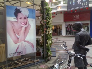 街头,雕塑默默的注视着广告牌上的美女。